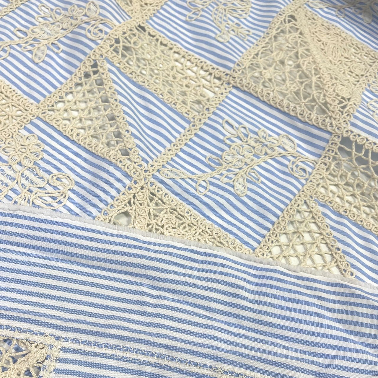 Тонкая смесовая ткань с интересным принтом из вставок с льняной вышивкой. Хорошо впитывает влагу, комфортна при носке. Держит форму. Прекрасно подходит для пошива платьев, сорочек, одежды в спортивном и романтичном стиле. Особо модная полоска и сочетание фактур позволит не только сшить изделие классической формы, но и поэкспериментировать с геометрией рисунка.